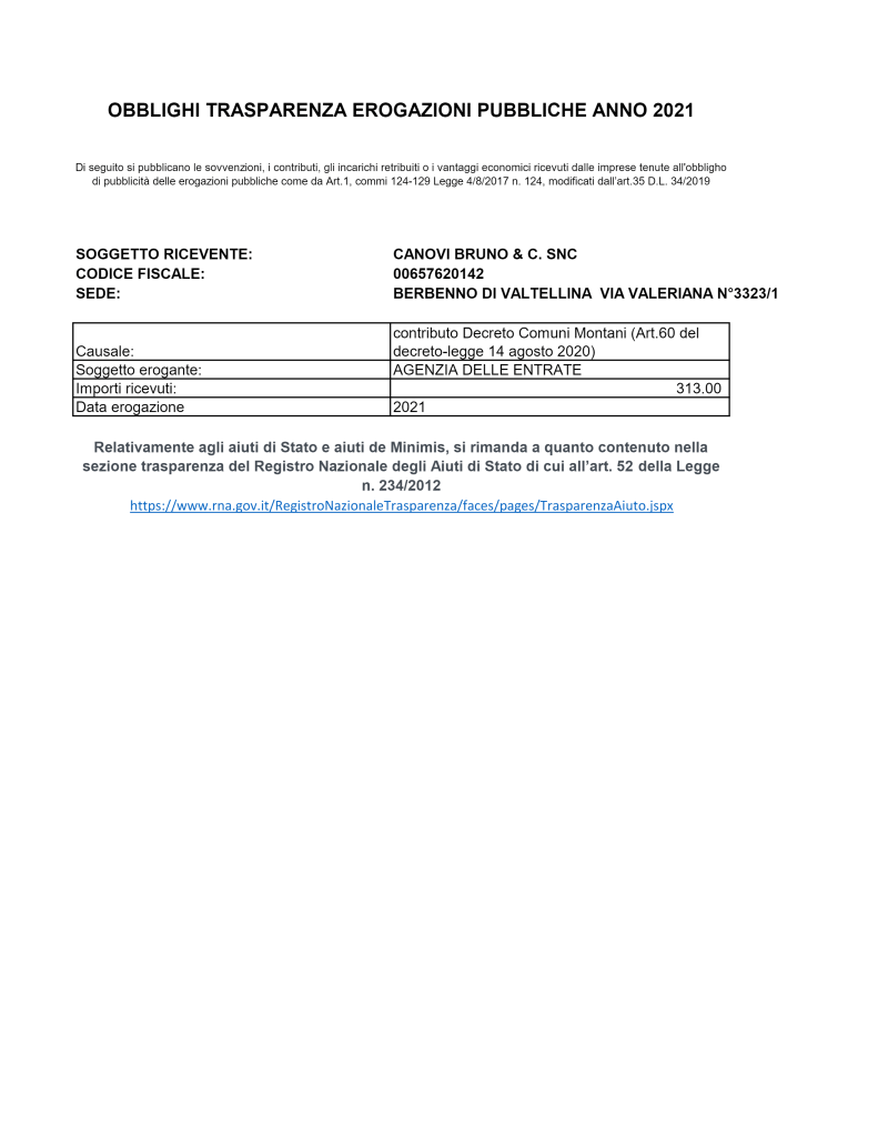 OBBLIGHI TRASPARENZA EROGAZIONI PUBBLICHE ANNO 2021
